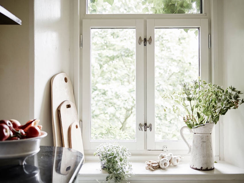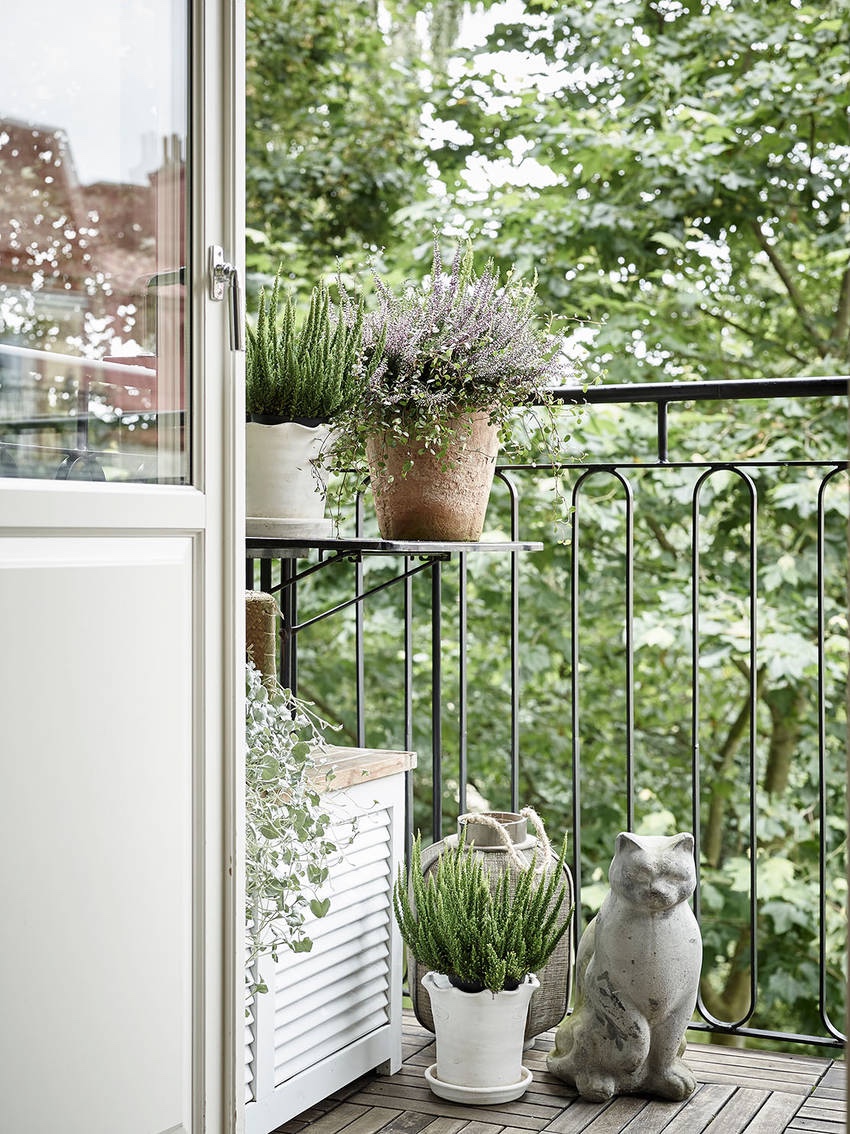 La estufa de cerámica es también original. Para crear el contraste perfecto con la luz que entra a través de los ventanales, se ha usado una paleta de colores en verdes, ocres/mostaza y marrones, en estilo otoñal, verdes, que se mezclan con los grises y blancos. Las plantas y el pequeño balconcito, introducen la naturaleza y el verde exterior, acentuando el estilo.