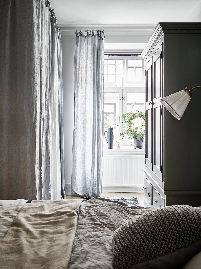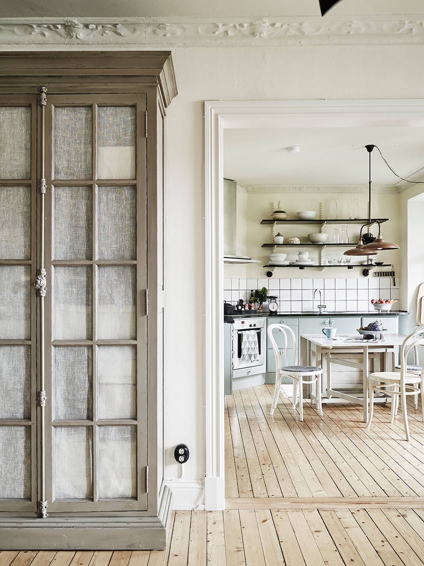 Este precioso y recogido apartamento es una muestra de la mezcla y el equilibrio perfecto entre distintos estilos, creando un espacio lleno de personalidad y con reminiscencias de tiempos pasados. Luminoso y lleno de matices, la vivienda cuenta con una base nórdica en cuanto a espacio y gama de colores se refiere, pero juega con los detalles y los elementos como piezas de mobiliario y materiales, que le aportan vida e historia. Como siempre, la estancia que más me gusta es la cocina que sin ser muy grande, desprende amplitud visual y luminosidad. En toda la vivienda el solado es de madera clara natural alistonada que le confiere calidez y se ha recuperado la moldura perimetral de los techos, original del edificio, muy típicos de las casas del siglo XIX y XX.