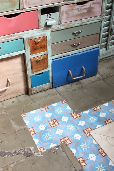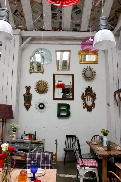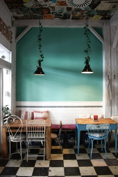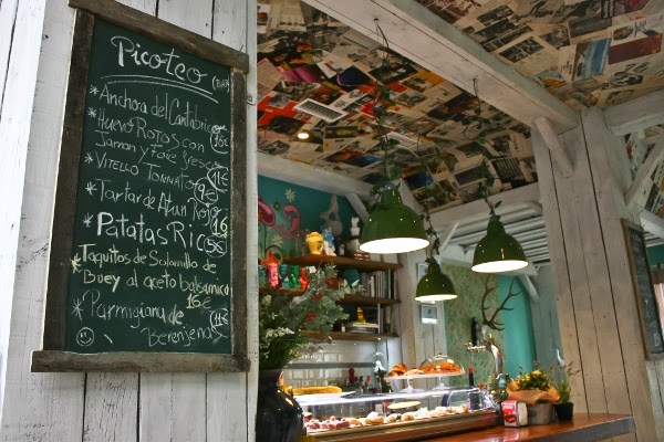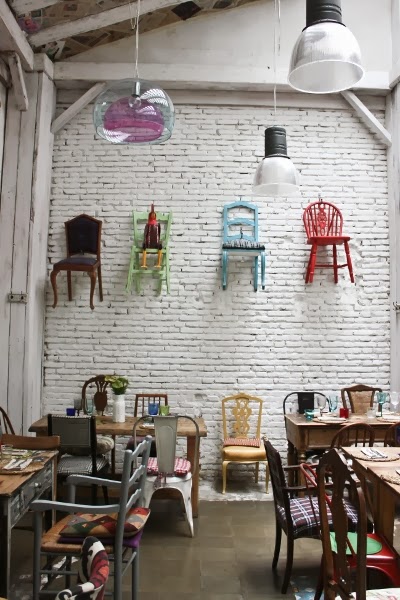 Todo el local se divide en 3 espacios diferenciados: 1) la entrada, con una zona preparada con mesas que invitan al café y a la tertulia, 2) la barra y el mueble-office que dan paso al salón-comedor y 3) la zona privada donde encontramos la cocina, el almacén y los servicios. Con un maravilloso y original solado recuperado hidráulico en damero y en gris, se fueron añadiendo piezas nuevas con color en los lugares en los que había que reponer material. Los paramentos verticales son variados: zócalos cerámicos con pintura y papel, ladrillo visto pintado de blanco, papel y pizarra, y cada uno de ellos decorado con marcos de fotos, espejos y sillas colgadas. El techo está presidido por el gran lucernario que ilumina la zona del comedor y un revestimiento en papel de diferentes publicaciones formando un collage.