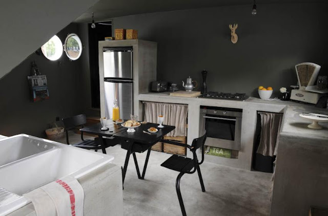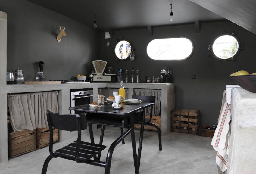 En la cocina, el mobiliario y las encimeras se realizaron en esquina, basado en el diseño y las directrices de la propietaria, en un material poco usual en un barco: el cemento. Dos antiguos pupitres escolares, pintados de negro y colocados enfrentados el uno al otro, se convierten en una insólita mesa para la cocina. Para resolver el almacenaje, se recurrió a antiguas cajas de madera barnizadas y equipadas con unas ruedas. La mezcla de elementos decorativos crean el ambiente perfecto.
