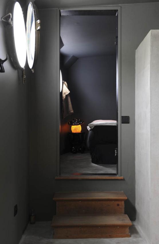Desde la cocina, unas escaleras de madera conducen a uno de los dormitorios para huéspedes, iluminado por un espectacular ojo de buey que deja pasar la luz natural del exterior. Los propietarios tuvieron que dar siete capas de pintura para conseguir el tono exacto que querían en este dormitorio. Sobre la cama, cabeza de alce realizada con virutas de madera de la tienda Le Bout du Monde (en Rennes).