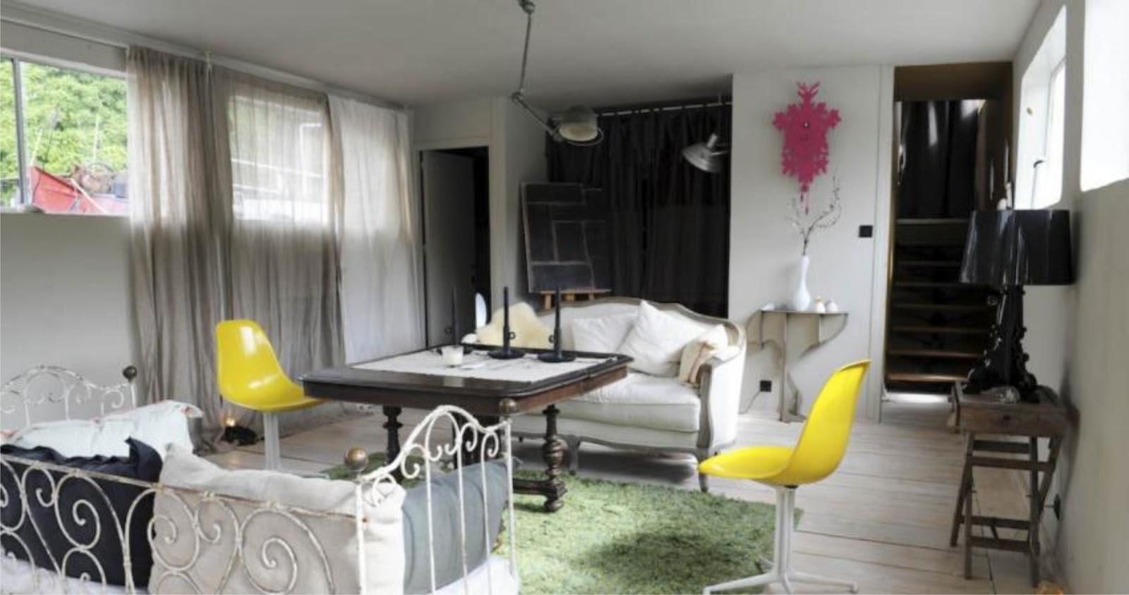 En torno a la mesa de comedor, una pieza antigua encontrada en el mercadillo anual de Rennes, se combinan sillas Louis Ghost, de Philippe Starck para Kartell, con mecedoras de Ikea y unas sillas amarillas recuperadas. Debajo, una alfombra de vaca remata la composición.