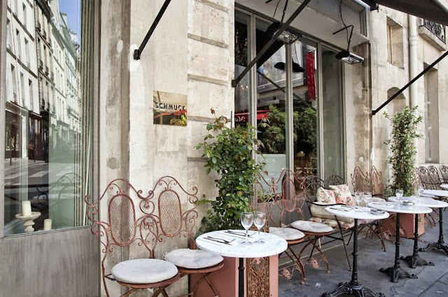 Hoy quiero mostraros, dentro del espacio [Places] un Restaurante y bar de copas en el margen izquierdo del río Sena, que se encuentra en un enclave del cine mítico de Saint-Germain-des-Prés: Schmuck. Un rincón parisimo que nos transporta al elegante siglo XVIII donde se mezclan los colores brillantes de los grabados, espejos y lámparas, cojines florales en la terraza, y el toque británico en todo el ambiente del bar.