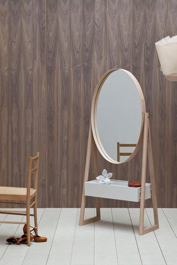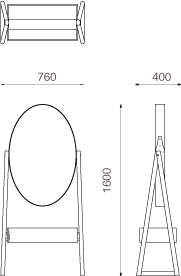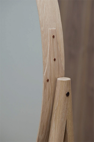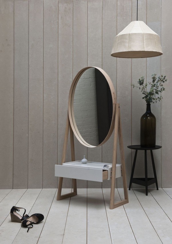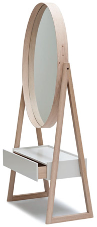 Se trata de un espejo elíptico enmarcado en madera maciza de roble con un acabado superficial de aceite blanco mate. Con remaches de bronce, apoya en unos caballetes en la misma madera tratada donde se apoya una pieza de cajón lacado blanco que en su parte superior se presenta como una bandeja a modo de tocador compacto 2 en 1.