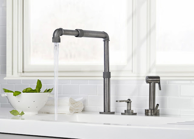 Imagina estos grifos en la cocina o en el cuarto de baño; de cualquier manera, se muestran no sólo como una pieza útil y funcional, sino también, son elementos que decoran el espacio deseado con una mezcla de industrial y contemporaneo. Yo reconozco la atracción inexplicable que supone el metal y la fontanería vista y decorativa. En las palancas de accionamiento de agua fría y caliente de esta grifería industrial se encuentran talladas las palabras Hot / Cold, como un detalle más. El grifo de la cocina industrial tiene un brazo telescópico que ayuda tanto con la función, como con la estética.