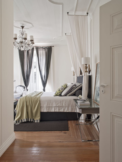 Un eclecticismo ingenioso y cálido que nos lleva a través de toda la vivienda que destaca por sus techos decorados con molduras y sus piezas de mobiliario en contraste: antigüedades y elelemtos de diseño moderno. Un solado en damero nos recibe de forma ideal para dar paso a la zona de salón comedor, llena de calidez con el solado de tarima de madera teñida en forma de espiga. La cocina resulta lumiosa y clara, con el juego de madera de los muebles. En el despacho el toque de color y atrevimiento viene de la mano del rojo.
