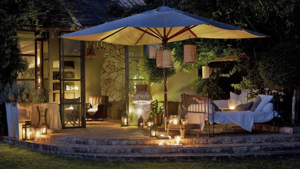 Un salón-estar a modo de «invernadero» con un solado en pieda adoquinada que se prolonga hasta el exterior en la zona de jardín aterrazado. Techos en altura con acabados en piedra y vidrio, que propician la entrada de luz en este espacio lleno de encanto de campiña y sabor rústico.